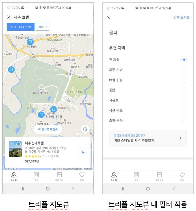 [트리플] 데일리호텔과 마찬가지로 지도뷰 내 일정, 인원 변경이 가능하며 필터를 함께 활용할 수 있습니다. 트리플은 ‘도시’를 기준으로 다양한 정보를 획득하고 일정을 짤 수 있기 때문에, 필터 내 도시 내 지역 단위로 살펴볼 수 있는 내용도 적용되어 있습니다. 또 하나 재미있는 점은 트리플은 지도 내 호텔 아이콘이 적용된 핀을 활용하고 있다는 점인데요. 하단에 카드 형태로 해당 숙소의 썸네일 이미지와 설명, 평점과 가격 정보를 바로 확인할 수 있도로 구성되어 있습니다. 가격을 먼저 보여주던, 숙소 종류를 먼저 보여주던 결국 앞선 서비스들은 특정 숙소를 탭 해야 정보를 상세히 볼 수 있었는데요. 이를 한 번에 해결할 수 있는 구성 방법이기도 합니다.