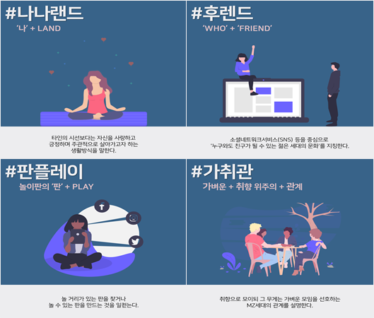 MZ세대를 설명하는 키워드 중 #나나랜드, #후렌드, #판플레이, #가취관 이라는 키워드들을 통해 MZ세대들은 ‘나’자신을 찾고 싶어 하고 사랑하며, SNS에 놀 수 있는 판을 만들어 이를 처음 보는 사람이라도 취향만 같다면 같이 즐기는 세대라는 것을 알 수 있습니다.