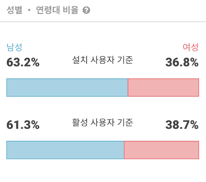 ‘하쿠나 라이브’ 앱의 성별 비율을 확인해보겠습니다. 설치 사용자 기준으로 남성 63.2%, 여성 36.8%으로 남성 비율이 여성에 비해 근소하게 높은 편입니다. 활성 사용자 기준은 남성 61.3%, 여성 38.7%로 설치 사용자 기준과 크게 차이 나지 않는 모습입니다. 대체적으로 10명 중 6명은 남자, 4명은 여자라고 볼 수 있겠네요. 이 정도 수치면 특정 성별에 치우치지 않고 남녀가 모두 좋아할 만한 서비스라고 판단할 수 있을 거 같습니다.
