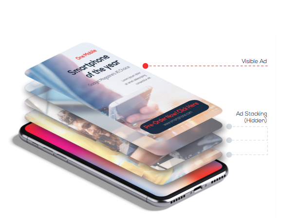 Ad Stacking은 Ad Fraud의 종류 중 하나로, 여러 개의 광고 배너를 겹쳐서 노출하는 방식입니다. 광고배너를 보는 사용자에게는 쌓인 광고 배너 중 최상단에 위치한 단 한 개의 배너만 노출됩니다. 그러나 실제로는 그 한 개의 배너 뒤로 여러 개의 배너가 함께 송출되므로, 광고주는 이 모든 배너에 대한 비용을 지불해야 합니다. 광고주 입장에서는 유효하지 않은 노출에 대해서도 광고 비용을 청구 받게 된다면 굉장한 골머리를 앓을 것입니다. 따라서 광고 노출을 KPI로 하는 광고주들에게 Ad Stacking은 치명적인 Fraud이며, 이를 사전에 판단하고 차단하는 것이 중요한 마케팅 전략 포인트입니다.