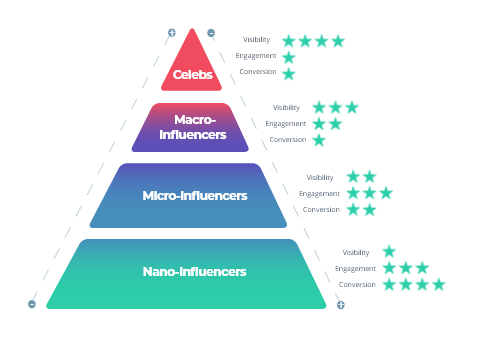 지칭하는 단어가 많다 보니, 의미도 다양하게 사용됩니다. 셀럽이나 메가 인플루언서에 대한 정의에는 다들 이견이 없지만, ‘마이크로 인플루언서’의 경우 업체별로 다른 의미로 사용하는 경우가 종종 있습니다. SNS 영향력을 기준으로 사용할 땐, 인플루언서의 등급을 메가, 매크로, 마이크로, 나노로 분류해서 정의합니다. 몇몇 전문가나 업체에서는 특정 영역의 전문가를 마이크로 인플루언서로 정의하기도 합니다.