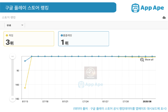 해당 앱은 7월 15일에 신규 출시되어 다음날인 16일부터 연이어 안드로이드 게임 카테고리 스토어랭킹 1~3위, 롤플레잉 카테고리의 스토어랭킹 1위를 기록하고 있습니다. (구글 플레이 스토어, ‘무료’ 항목 기준)