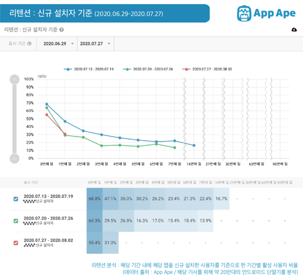 신규 출시 후 첫째주(2020.07.13 ~ 2020.07.19)에 설치한 사용자의 7일 후의 리텐션율이 22.4%, 그 다음주(2020.07.20~07.26)에 설치한 사용자는 13.9%로 나타났습니다. 즉, 첫째 주에 설치한 사용자의 생존율이 약 8.5% 더 높았습니다. 앞으로의 이벤트나 업데이트에 따른 리텐션율의 변화를 지켜볼 필요가 있을 것 같습니다.