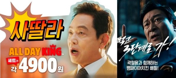 앞서 비(정지훈)가 부른 ‘깡’처럼 2002년 방송된 드라마 ‘야인시대’ 속 배우 김영철의 대사 ‘사딸라(4달러)’와 2008년 개봉한 영화 ‘타짜’에 출연한 배우 김응수의 대사 ‘묻고 더블로 가’를 활용한 광고는 밈 문화의 유행을 타고 인기를 얻은 스타들을 유통 광고 모델로 캐스팅한 케이스이다. (재인용: “화려한 포장이 나를 감싸네~”… ‘깡’ 열풍 타는 유통업계)