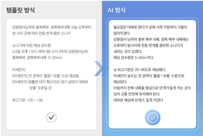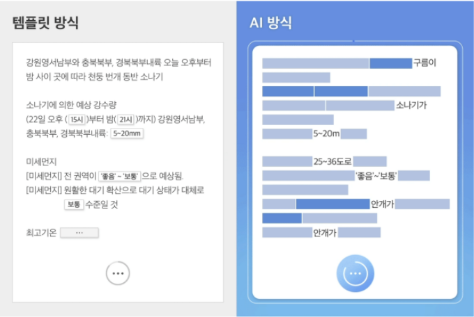 아침, 점심, 저녁. 하루에 3번 날씨를 확인할 수 있으며 단순히 템플릿에 필요한 데이터만을 넣는 형태가 아닌 날씨 상황의 다양한 케이스를 파악하여 기사를 작성하고 있으며, 다시 이야기하면 기존 ‘템플릿 방식’이 아닌 ‘AI 방식’을 활용하여 기사를 작성하고 있다. 아마도 아래 이미지를 보면 이해가 좀 더 빠를 듯하다.