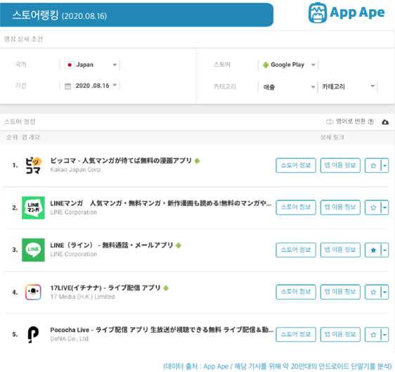 지금 일본의 구글 플레이 스토어 랭킹의 전체 카테고리 상위 5개 앱은 어떤 앱일까요?