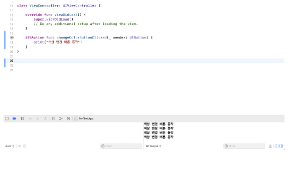현재 작업 코드는 print(“색상 변경 버튼 동작”)입니다. print도 Swift가 제공하는 함수입니다.