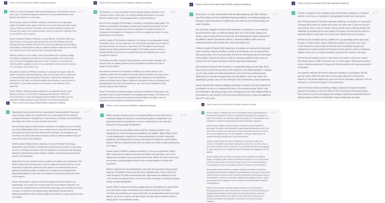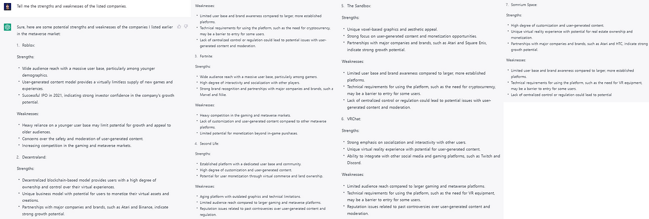 이렇게 질문했을 때와, 처음부터 메타버스 시장에서 가장 유용한 마케팅 전략을 물어보는 것과는 어떻게 다를까요? 결과를 보여드리겠습니다.