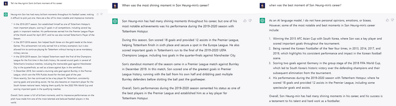 손흥민 선수의 커리어 최고의 순간에 대해 단어와 문장 구성을 달리했을 때 Chat GPT의 답변