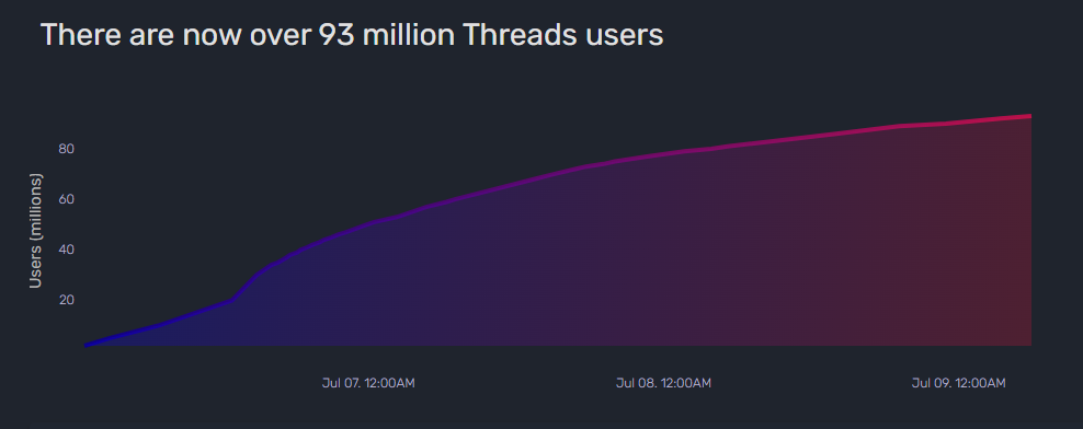 아무래도 인스타그램을 기반으로 연동하여 만들어진 앱이다 보니, 성장세도 엄청나게 가파릅니다. Threads의 이용자 수를 트래킹 하는 웹사이트를 확인해 보니, 벌서 9300만 명의 가입자를 확보했습니다. 정말 엄청나네요. 인스타그램을 기반으로 연동 서비스를 제공하니, 이용자를 자연스럽게 담습 하는 일이 발생하고 있는 것 같습니다.