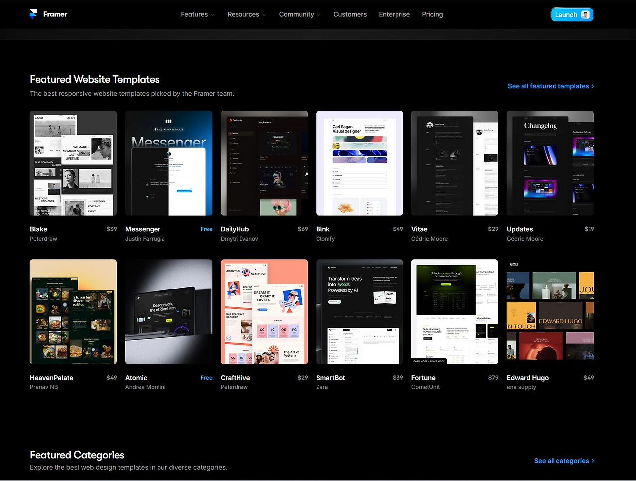 Framer를 활용하면 코딩 지식 없이도 어렵지 않게 홈페이지를 만들 수 있습니다. Framer를 활용하여 편리하게 홈페이지를 만드는 방법은 크게 두가지 방법이 있습니다. 두 가지 방법 중 첫 번째는 다른 사용자가 미리 만든 템플릿을 활용하는 것입니다. 이를 위해 Framer의 첫 화면에서 ‘Templates’ 아이콘을 클릭하면, 아래와 같이 다양한 템플릿이 제공되는 페이지로 이동합니다.