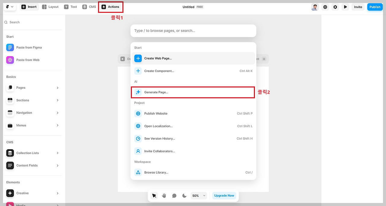 Framer에 탑재된 AI를 활용하기 위해서는 아래 화면 좌측 상단에 있는 ‘Actions’ 버튼을 클릭한 후 활성화되는 메뉴 중 ‘Generate Page…’를 클릭합니다. 해당 버튼을 클릭하면 하단 화면과 같이 프롬프트 입력창이 생성됩니다. 특이한 점은 입력창 안에 프롬프트의 예시들이 번갈아가며 제시됩니다.