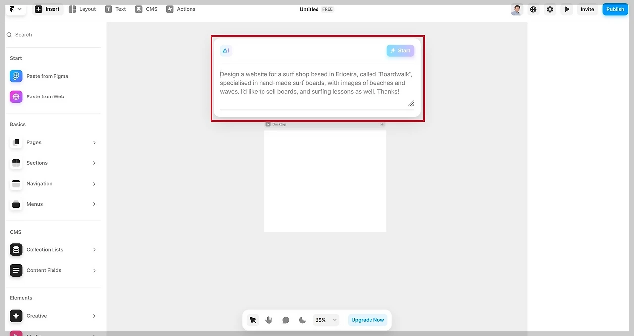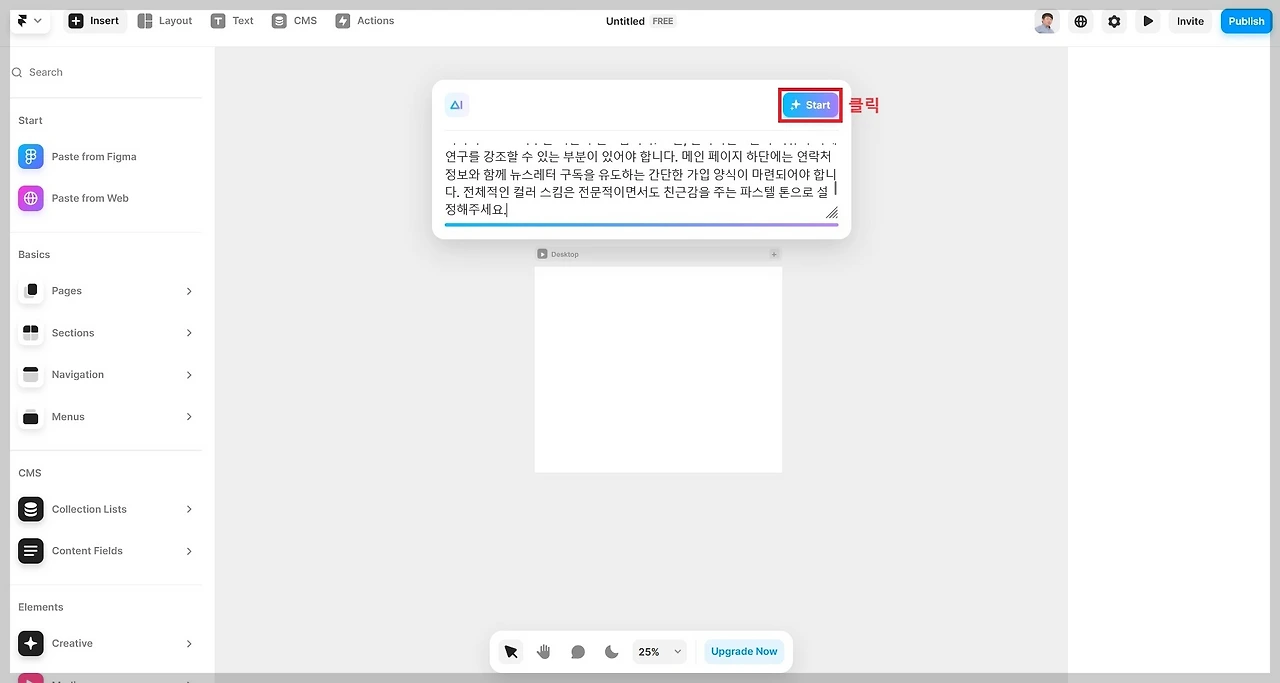 ChatGPT가 제시해준 프롬프트를 복사하여 Framer AI 프롬프트 창에 붙여 넣기 하고 ‘Start’ 버튼을 클릭하면 Framer는 홈페이지를 자동으로 생성합니다.