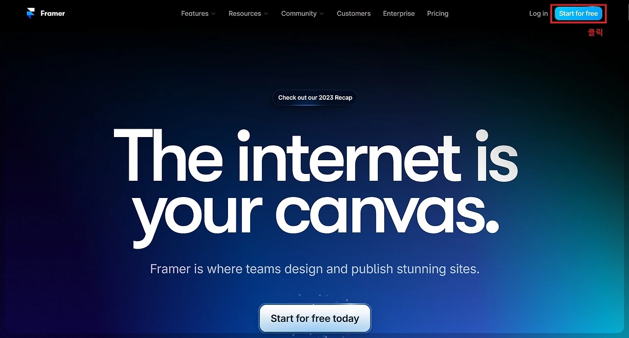 Framer를 사용하기 위해서는 먼저 URL을 통해 Framer 웹사이트에 접속하여 회원을 가입해야 합니다. 아래 제시되어 있는 화면과 같이 홈페이지에 접속한 후, 화면 상단에 있는 ‘Start for free’를 클릭하여 프레이머 계정을 생성합니다. 이미 계정이 있는 경우에는 ‘Log in’ 버튼을 클릭하여 계정에 로그인 합니다.