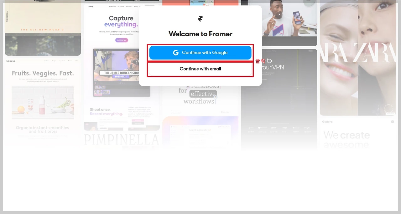 위 화면과 같이 ‘Start for free’를 클릭하여 회원가입을 진행하면 ‘Continue with Google’과 ‘Continue with email’ 두가지 메뉴가 제시됩니다. ‘Continue with Google’은 구글 계정을 통해 Framer에 가입하는 방법이며, ‘Continue with email’은 이메일 인증을 통해 Framer에 가입하는 방법입니다. 둘 중 가입하기 편한 방법을 활용하여 가입하시면 됩니다.