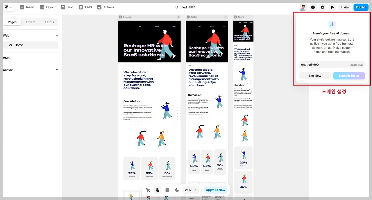 아래 화면과 같이 프롬프트에 따라서 HR Saas 업체를 소개하는 홈페이지가 제작되었습니다. 홈페이지가 생성된 후에는 우측 상단에 도메인을 설정할 수 있는 창이 활성화 됩니다.
