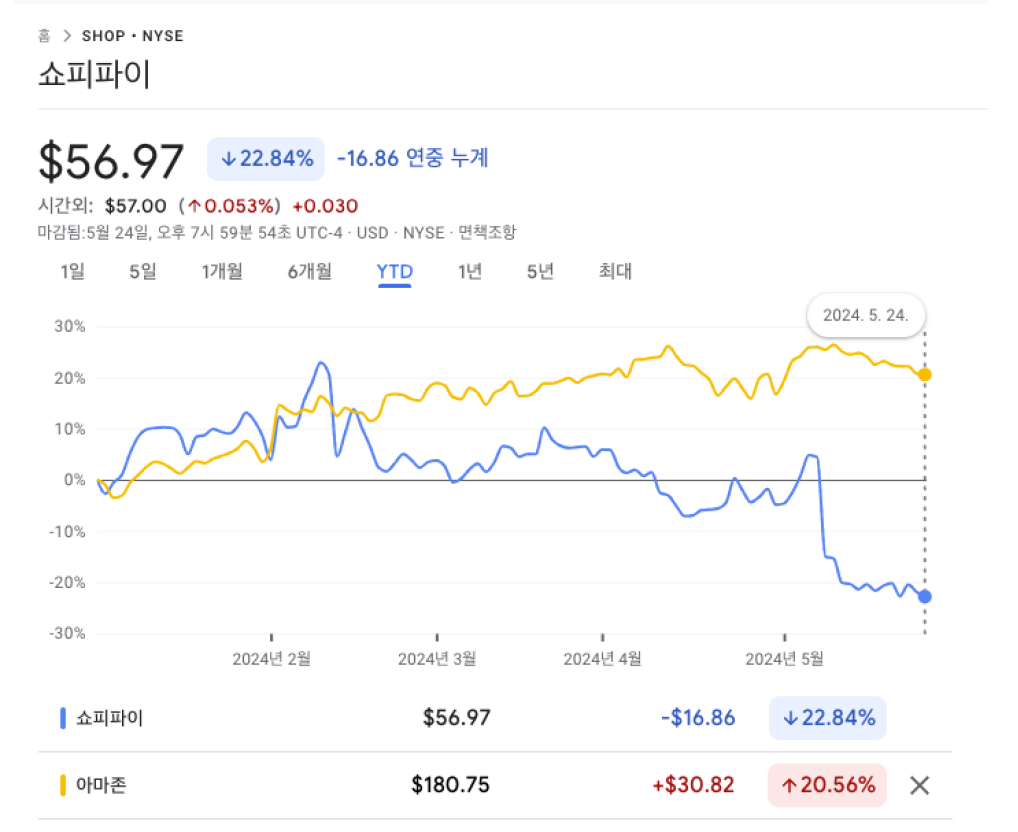 지난 8일, 쇼피파이가 2024년 1분기 실적을 발표했습니다. 실적도 실적이지만, 그보다 조금 부정적인 2분기 가이던스를 내놓으면서 쇼피파이의 주가는 20% 가까이 하락했습니다. 나스닥(NASDAQ)이 연일 좋은 흐름을 보여주고 있는 것과 대조적입니다.