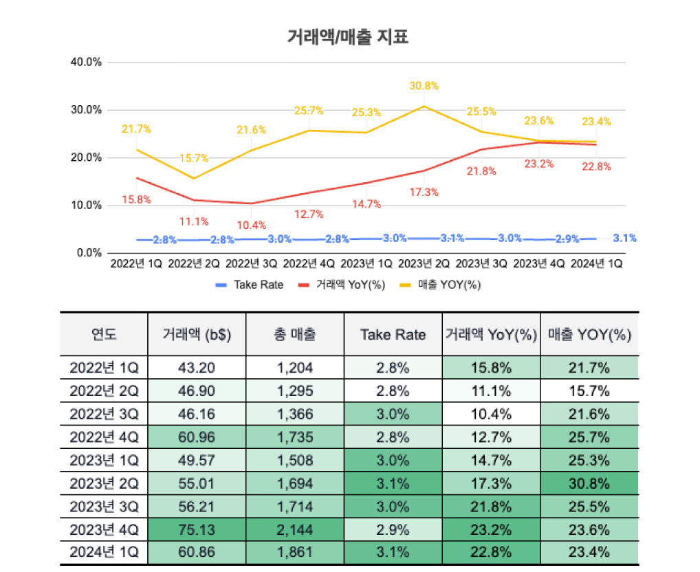 이런 우려에 쇼피파이의 성장 둔화는 겹악재로 작용했습니다. 실적을 보면 쇼피파이는 거래액의 성장률보다 매출액의 성장률을 10%p 정도 높게 가져왔습니다.