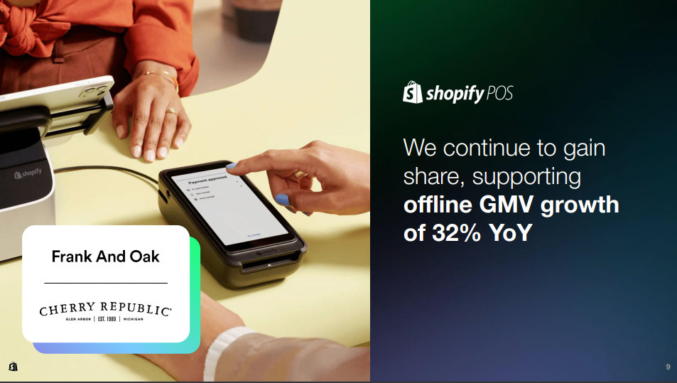 최근 쇼피파이의 실적 발표 자료에서 POS의 거래액이 지속적으로 상승하고 있음을 강조하고 있습니다. POS 거래액은 YoY 32% 상승으로, 쇼피파이 이커머스 중심의 전체 거래액이 YoY 23% 성장한 것과 비교하면 높은 성장률을 보여주고 있습니다.