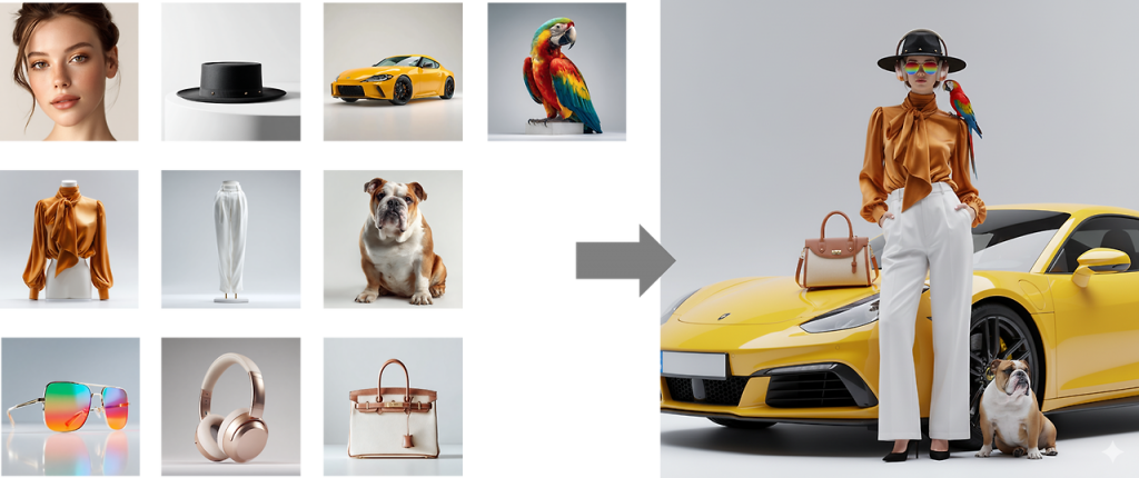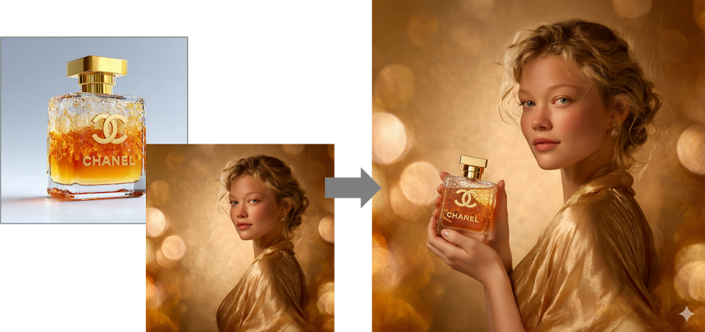 나노바나나는 두 개 이상의 참조(Reference) 이미지를 받아 각각의 핵심 요소를 추출하고, 이를 하나의 일관된 장면으로 자연스럽게 합성한다. 예를 들어 향수 제품 사진(A)과 인물 사진(B)을 함께 업로드한 뒤 “인물이 A 향수를 손에 들고 있는 장면을 만들어줘”라고 요청하면, 나노바나나는 단순히 두 이미지를 결합하지 않고 인물의 피부 톤, 조명 방향, 질감, 제품의 반사광과 색감을 정밀하게 분석한다. 이렇게 광원·그림자·색조를 재계산함으로써 마치 하나의 스튜디오에서 동시에 촬영한 듯한 조화롭고 사실적인 결과물을 만들어낸다.