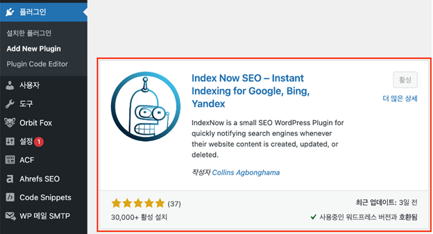 먼저 워드프레스 관리자 페이지에서 플러그인 >> 새로 설치(Add new Plugin)로 이동하여 Index Now 플러그인을 설치해 줍니다.