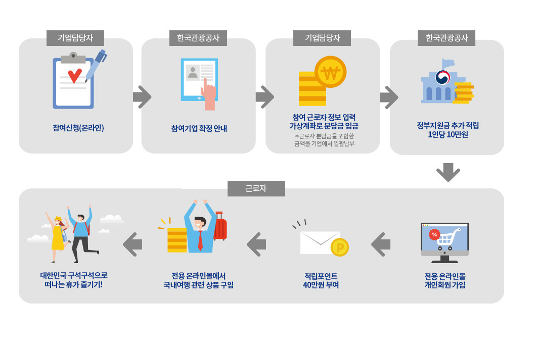 이렇게 입금이 모두 이루어지면 해당 계좌로 정부지원금 10만원이 추가 적립되는 구조에요. 여기까지 진행이 되면 안내된 전용 온라인몰에서 각 근로자에게 40만원 상당의 포인트를 지급하게 되고요. 근로자들은 해당 온라인몰에서 국내 여행 관련 상품들을 구매할 수 있게 됩니다.