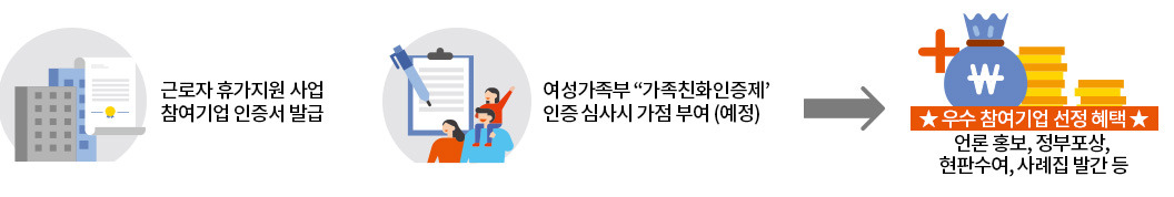 참여기업에게는 근로자 휴가지원 사업 참여기업 인증서가 발급되고요. 여성가족부에서 실시하는 <가족친화인증제>에 대한 인증심사시 가산점을 부여한다고 합니다. (이 부분은 확정된 사항은 아니고 예정된 사항입니다.) 그리고 언론 등에 홍보가 나가고요. 정부포상 및 현판수여, 사례집 등에 수록됩니다.