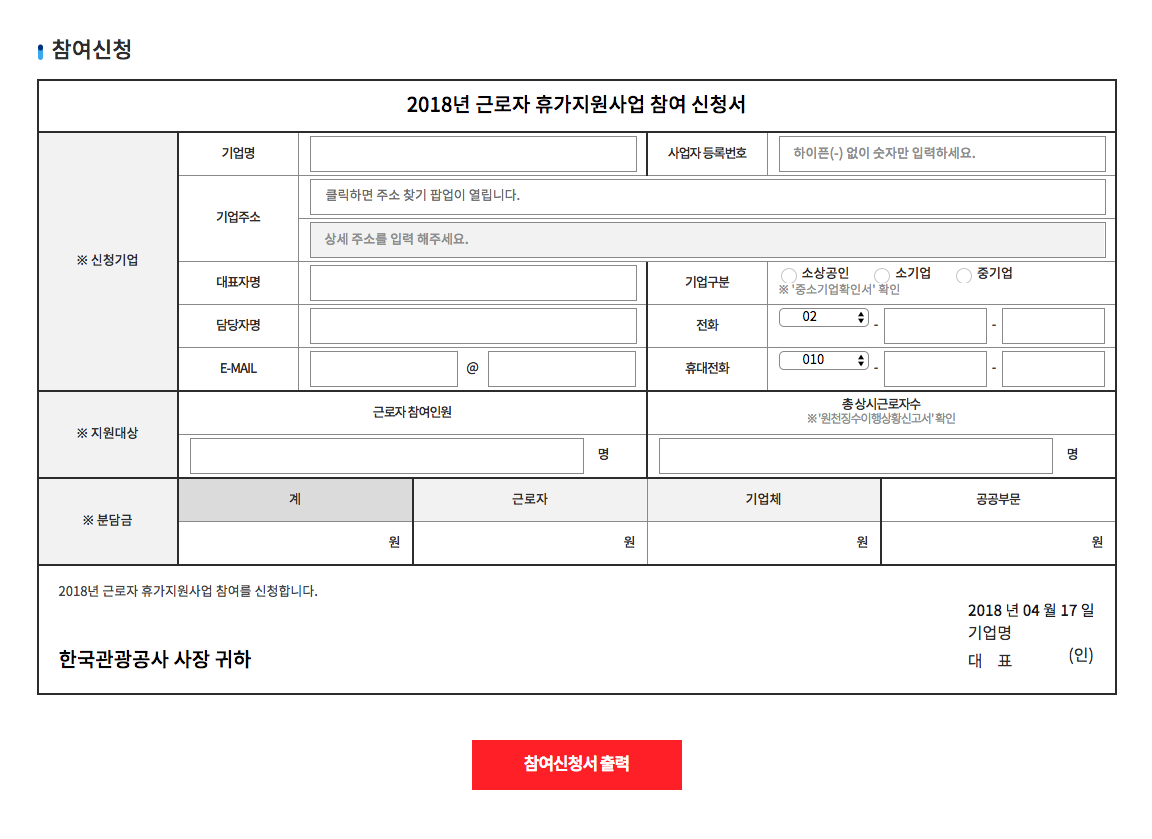 우선 한국관광공사에서 운영하는 ‘근로자 휴가지원 사업' 홈페이지에서 신청을 할 수 있습니다. 근로자 본인이 신청하는 것이 아니라, 해당 업무를 맡고 있는 기업 내 인사담당자 등 담당자가 신청을 해야합니다. 필요 서류로 다음의 것들을 신청시 제출해야 합니다.