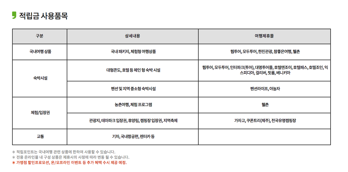- 적립 포인트 40만원은 전용 온라인 몰에서만 사용 가능합니다. 해당 온라인 몰에는 숙박, 관광지 입장권, 체험 상품, 패키지 상품, 교통 등 여행 관련 상품들이 포함될거라고 하네요. 해당 제휴 온라인몰 리스트는 아래 표에서 확인하세요.