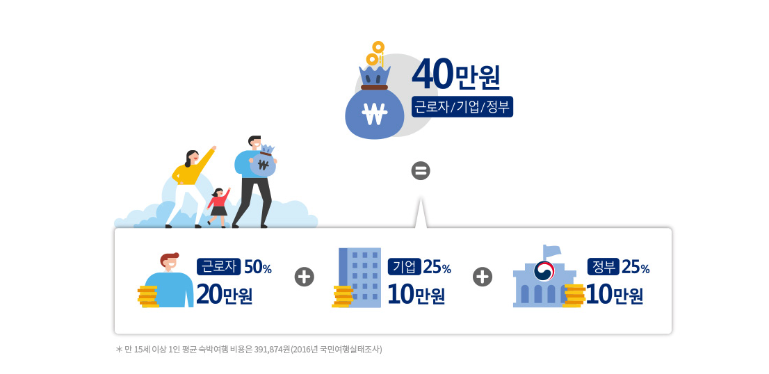근로자 휴가지원 제도는 2018 정부의 국정과제로 추진되는 사업으로서 올해 첫 물꼬를 틀게 됐습니다. 정확하게는 단순 휴가지원비라기보다는 국내 여행시 해당 경비를 지원해주는 제도인데요. 근로자가 휴가를 내고 국내 여행을 떠날 계획을 가지고 있다면 근로자 본인부담 20만원, 기업 10만원으로 여행적립금을 조성합니다. 이에 정부에서 10만원을 더 지원해줌으로서 휴가비 20만원을 지원해주는 제도로 널리 알려지게 됐죠. 프랑스의 ‘체크바캉스' 제도를 참고하여 만든 제도라고 하네요. 대기업이 비해 복지를 챙기기 어려운 소기업이나 중기업, 그리고 중소기업 등에서는 적절하게 활용하면 근로자 복지를 높이는데 큰 도움이 될 것으로 보이네요!