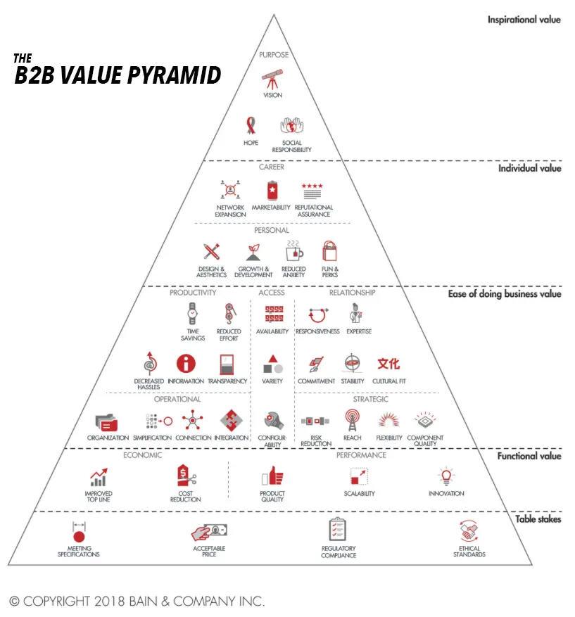 즉 B2B와 B2C가 다른 점은 (1) 이해관계자가 많다. (2) 구입을 결정하기 위한 의사 결정 체계가 복잡하다. (3) 구입 결정자와 실제 제품/서비스 이용자가 다릅니다. 이에 따르는 계층별 B2B 가치를 살펴봅니다.
