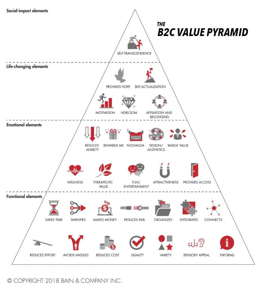 저는 가치 계층 구조를 깔끔하게 요약한 두 개의 시각적 다이어그램을 포함했습니다. 하나는 B2C용이고 다른 하나는 B2B용입니다. Maslow의 요구 계층 구조(위 이미지)에 익숙하다면 다른 계층에 매핑된 값의 많은 유사성을 볼 수 있습니다. 추가 브랜드 가치 카테고리를 통해 구체적인 예시를 살펴봅니다.