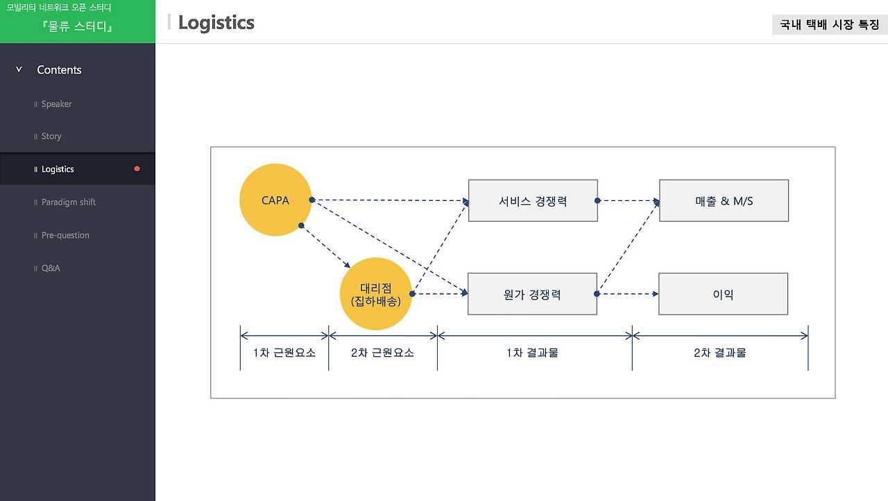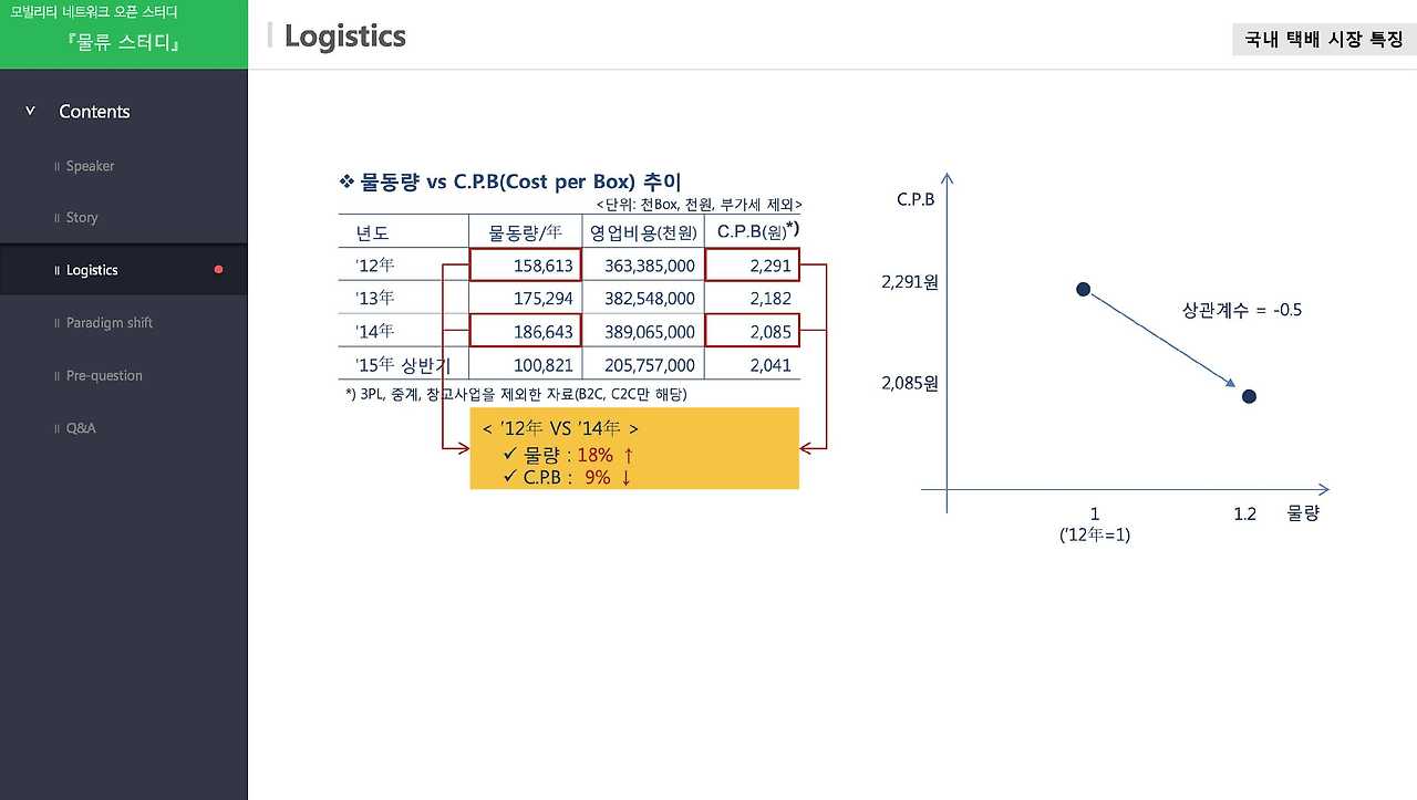 결국 이 그림을 통해 과거 택배 물류 시장의 전략적 방향에 대해 설명하지 않는가 합니다. 1차적으로 물량을 기초로 원가를 낮추고, 이를 통해 매출 확대/시장 점유율을 확대해 왔다면, 이제는 서비스 경쟁력을 바탕으로 매출과 이익을 극대화시키는 방향으로 진보하지 않을까 합니다.