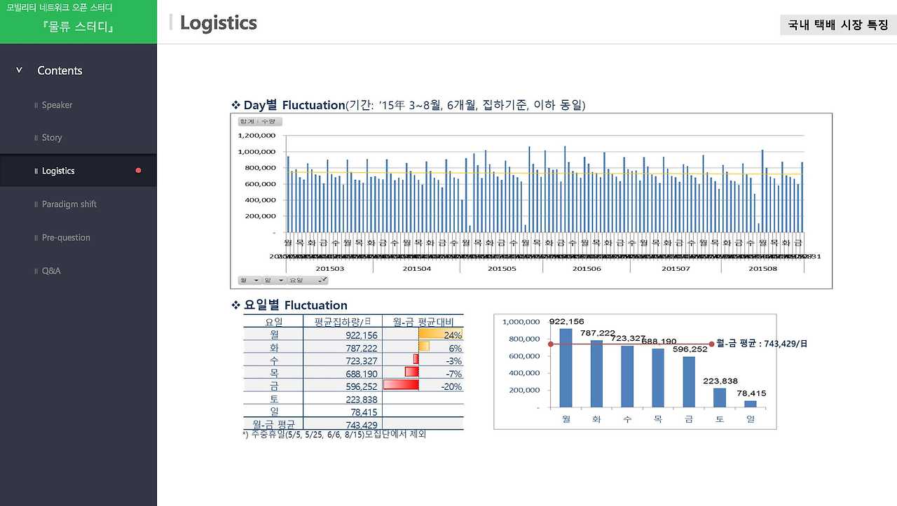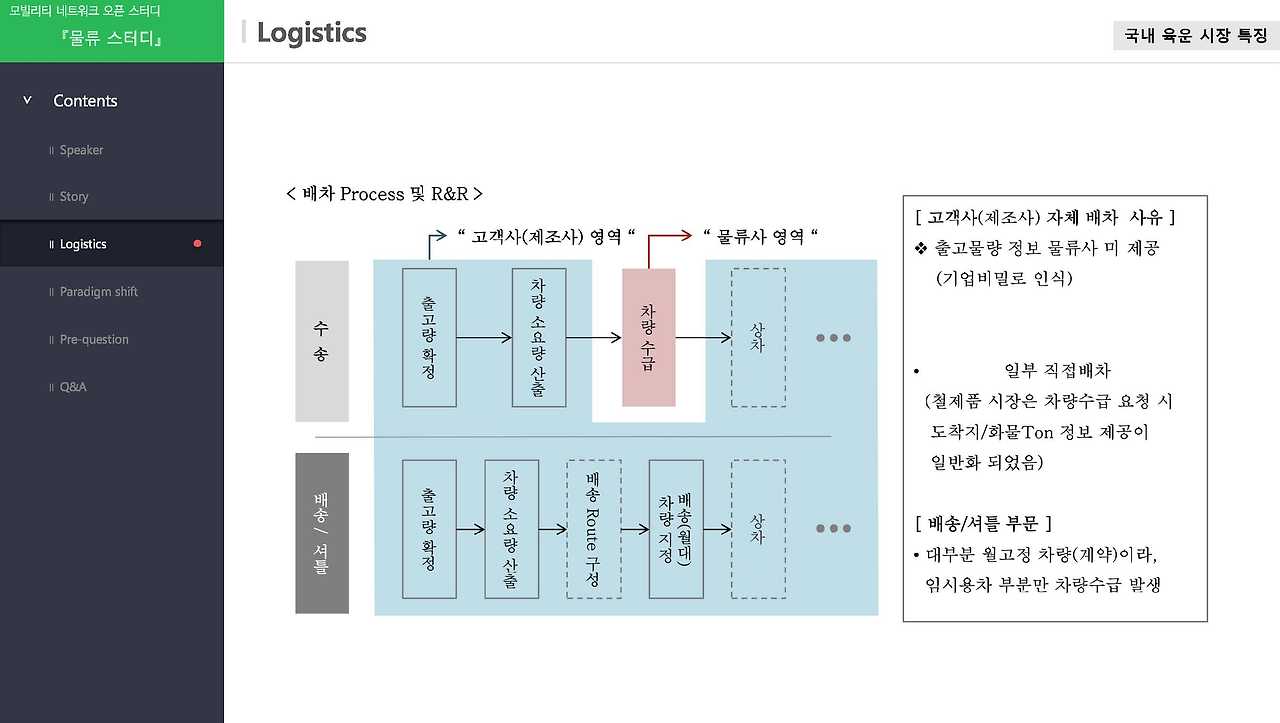 이 장표는 실제 업무를 통해 알 수 있는 사항으로 출고 물량의 정보의 중요성에 대해 언급한 장표입니다. 이 부분이 물류 서비스를 제공하려는 회사의 벽이 더 큰 이유가 설명이 되는 부분이 아닐까 합니다. 출고 물량 정보는 물류의 흐름을 기반으로 사업을 하려고 하는 회사들에게 꼭 중요한 정보입니다 하지만, 기업을 비밀로 인식할 만큼 중요한 정보를 얻는 일은 쉽지 않은 작업으로 생각됩니다.