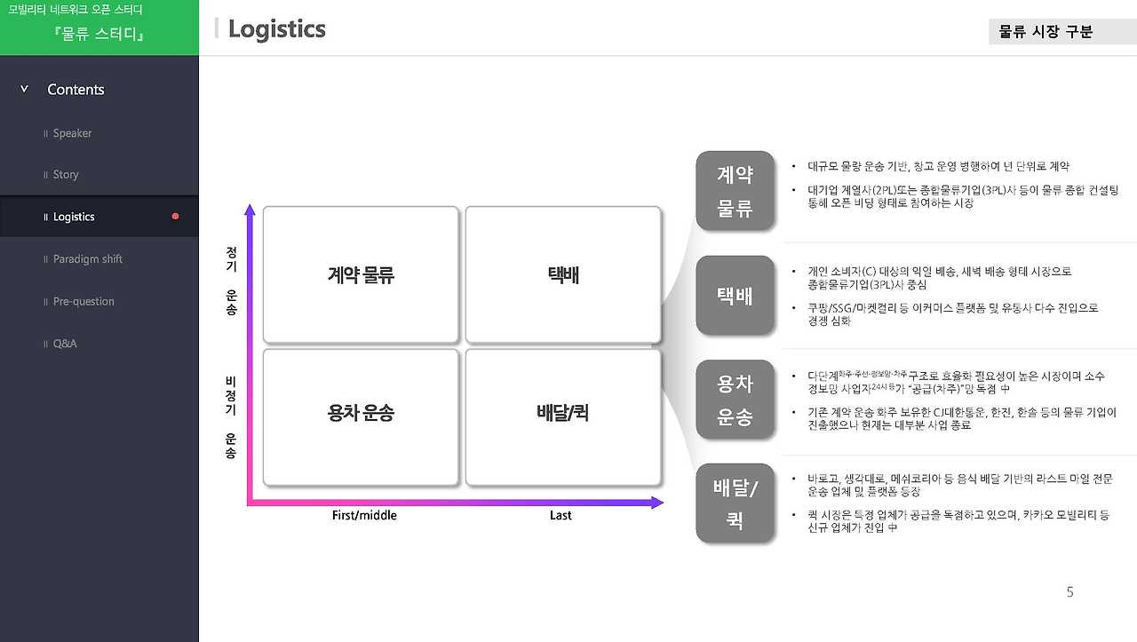 물류 시장의 구조화하면 물류 구간과 정기 여부에 따라 2개의 축에 따라 구분이 가능합니다.
