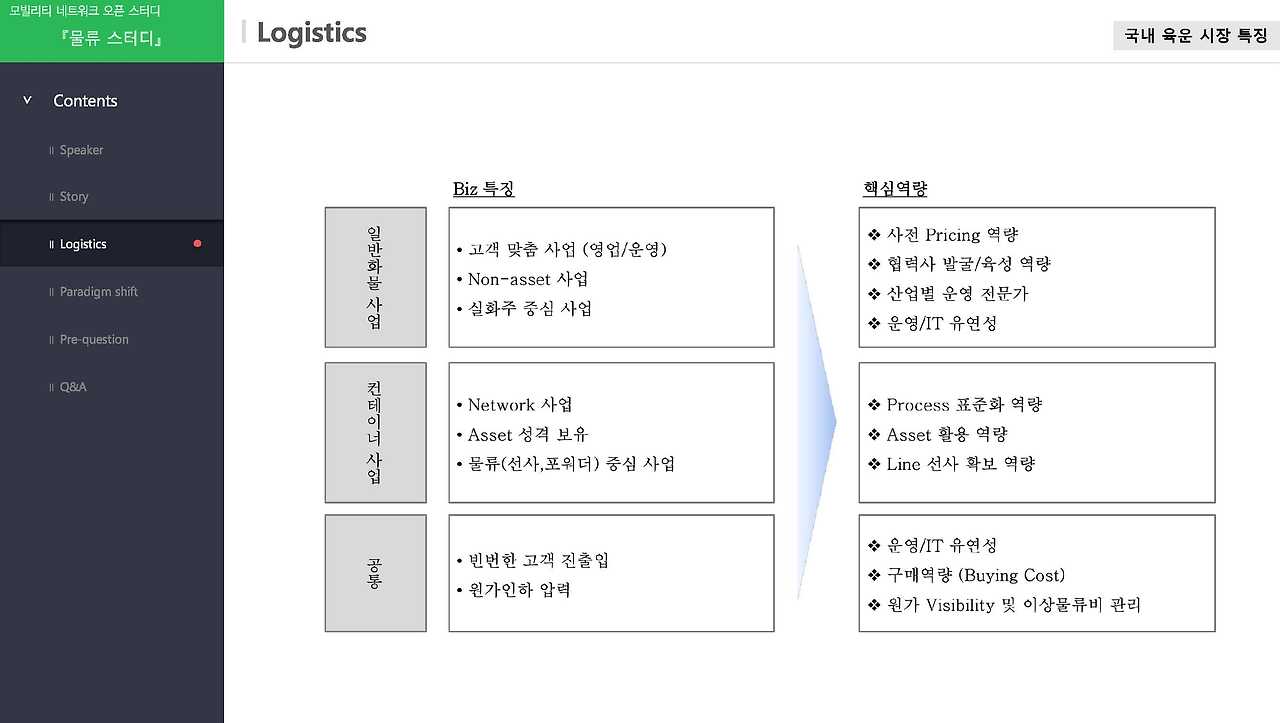 각 시장별 특징에 따른 혁심 역량을 소개한 장표입니다. 컨테이너 사업과 일반화물 사업 특징에서 Asset 성격을 보유 그리고 일반 화물을 Non-Asset 사업으로 보는 관점은 실제 사업에 있어서 나올 수 있는 관점이 아닐까 했습니다. 이러한 특징 때문에 Process의 중요도가 나왔다고 생각합니다.