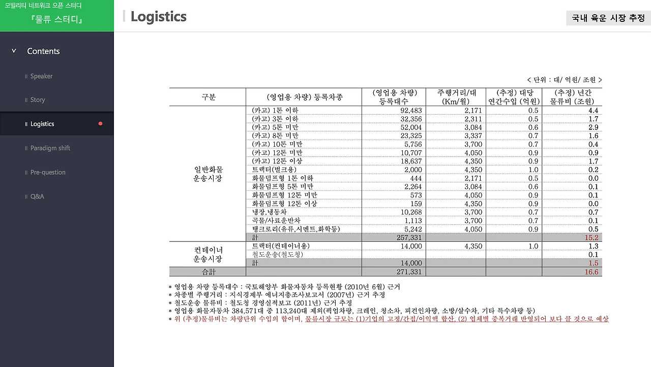 시장 추정에 있어서 여러 방법이 있지만, 물류 차량 기반으로 시장을 추정하는 것이 좋은 방법 중에 하나라고 봅니다. 실제 물류 시장 규모가 100조이다. 60조이 말을 하지만 실제 그러한 시장인지는 한번 고민해 봐야 할 영역이라고 봅니다.