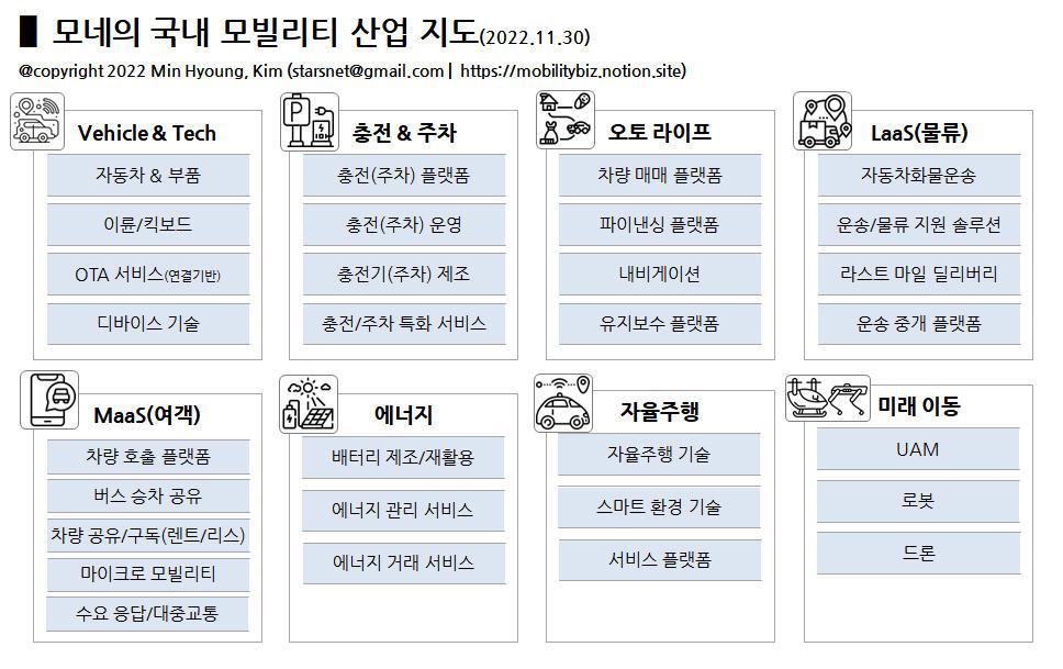 국내 모빌리티 산업 지도로 구분하여 크게 몇 가지를 정리해 보고자 합니다.