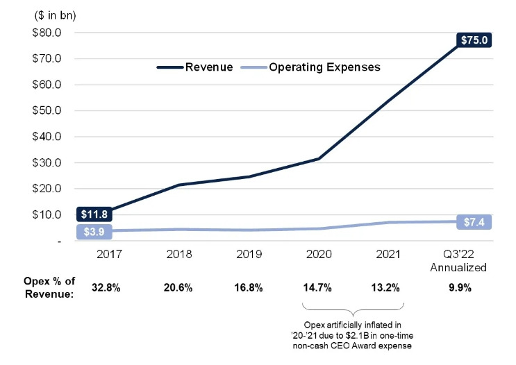 하지만, 이러한 테슬라의 경영방식을 이해하기 위해서는 전체 테슬라의 경영 전략에 대한 이해가 필요합니다. 테슬라의 기본적은 경영전략은 최대 생산, 최대 매출로 이를 달성하기 위해 매출성장 극대화, 누진팜내 대수 극대화, 상품성 향상이라는 목표를 달성하고자 하고 있습니다. 이 중 매출성정극대화 전략 방향에 판매성장률의 중요성이 있습니다. 영업레버리지 효과를 가지기 위해서는 판매성장율이 무엇보다 중요합니다. 즉 현재 시점에서 테슬라에게 중요한 지표는 판매가격, 판매량 등과 같은 지표가 아니라는 판매 성장률과 영업이익률을 입니다. 그동안의 매출과 운영비용의 성장률을 보더라도 이러한 전략 방향을 잘 수행하고 있는 것으로 보여 집니다.