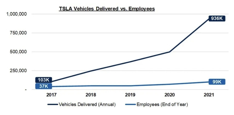 예를 들어 직원 고용 증가에서 이러한 모습을 볼수 있습니다. 지난 5년 동안 (2017~ 2021) Tesla는 배송을 9.1배 늘린 반면 인력은 2.6배만 늘었습니다. 최적화된 서비스(즉, 모바일 서비스)와 결합된 높은 자동화 및 온라인 판매 조합은 낮은 인건비 증분으로 비즈니스 확장을 하고 있습니다.