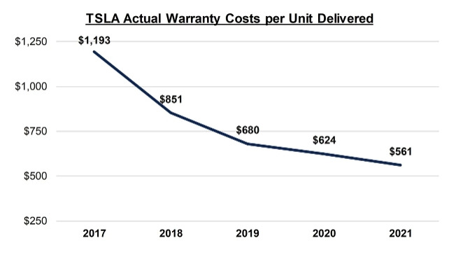 또한 Tesla는 서비스 직원당 더 많은 차량을 판매할 수 있습니다. 서비스 요구 사항(및 관련 현금 보증 비용)이 차량 조립 품질 개선을 통해 감소하기 했기 때문입니다. 실제로 Tesla는 현재 Toyota 다음으로 단위당 현금 보증 비용이 두 번째로 낮습니다. 보증 비용은 COGS 내에 있지만 차량당 보증 비용이 낮다는 것은 빌드 품질이 향상되었다는 증거입니다. 더 안전한 운전자 지원 기능으로 인해 사고율이 낮아지는 이러한 추세는 규모가 커짐에 따라 (SG&A 내에서) 새로운 서비스 직원의 필요성을 줄입니다.
