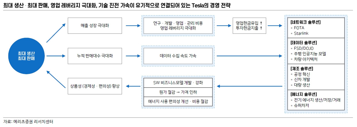 보고서에 구체적으로 언급 내용으로 구체적으로 전략 방향은 결국 ‘하드웨어 기술 혁신 통한 원가 절감 →더 낮은 가격대 시장으로의 확장 + 더 많은 세그먼트로의 확장 → 소프트웨어 기술 혁신 통한 비즈니스 모델 확대 → 최대 생산, 최대 판매 → 영업 레버리지 극대화’가 이어진다.