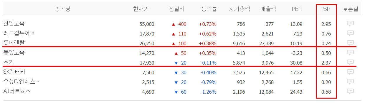 이에 따라 쏘카의 PBR (Price to Book Ratio)는 2.77배 이고 롯데렌탈의 PBR 은 0.92배로 장부가치 보다 낮은 주가를 보여주고 있습니다. 참고로 FN가이드를 기준으로 살펴보면 네이버의 PBR 은 2.68배이며, 엔씨소프트 2.56배, 카카오 3.33배입니다.