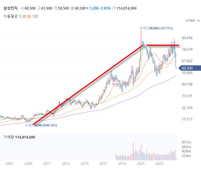 삼성전자 주가 차트를 보면 대략 2010년부터 2020년까지 고속성장을 한 것을 알 수 있으며, 2020년 이후 정체된 모습을 보이고 있습니다.
