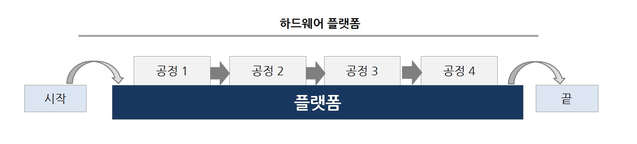 하드웨어에서는 이런 프로세스와 물리적 장치가 ‘플랫폼’입니다. ‘현대 소나타’와 ‘기아 K5’가 플랫폼을 공유한다는 이야기를 들어보셨을 겁니다. 플랫폼에는 엔진, 조향장치 외에도 품질검수 및 부품의 표준규격 등도 함께 포함됩니다. 이런 것들은 새로운 차를 만들 때 개발비용을 낮추어 주고 높은 품질 수준을 달성하기 쉽게 만들어줍니다. 즉 하드웨어에서 플랫폼이란 표준 공정을 통해 다양한 제품을 만들어내는 기반이자 도구를 지칭합니다.
