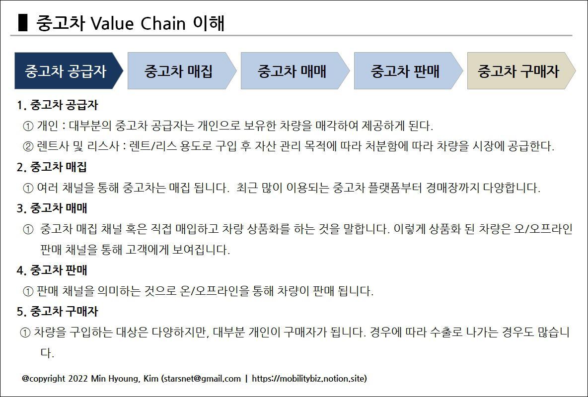예를 들어 중고차 공급자의 주요 사업자는 "렌터카 혹은 리스 사업자"로 볼 수 있습니다. 주요 사업목적에 따라 다량의 차량을 사업에 이용한 이후 차량을 대규모로 차량을 제공합니다. 중고차 매집 단계의 주요 사업자는 "헤이딜러" 볼 수 있습니다. 보통 개인 고객이 차량을 매각하기 위해 이용하는 플랫폼으로 사용합니다. 중고차 매매는 "중고차 매매상"으로 볼 수 있습니다. 중고차 매매업 면허를 가지고 있는 사업자로 흔히 중고차 매매단지에 존재하는 사업자입니다. 중고차 판매는 "KB 차차차", "케이카"와 같은 기업이 이 단계의 주요 사업자에 속합니다. 중고차 구매자는 대부분 개인에 해당하며 일부 기업이 있고, 경우에 따라 수출업자가 이해 해당합니다.