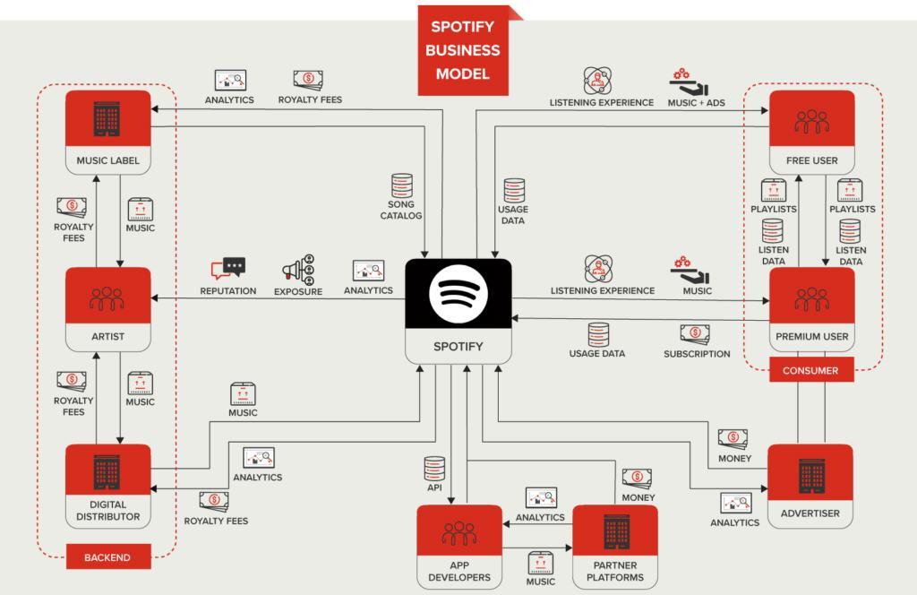마지막 단계로 비즈니스 모델 캔버스를 그립니다. 아래 캔버스는 Spotify 비즈니스 모델 캔버스로 비즈니스 모델 프로세스의 광범위한 요소가 함께 결합되어 있음을 보여줍니다.