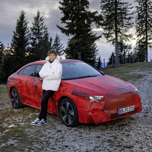 영하의 날씨를 뚫고 특별한 차를 타고 계곡으로 향한다. 그의 차는 곧 출시될 CLA의 위장막 버전으로, 눈부신 붉은색 조명을 달고 인상적인 에너지 회복 성능을 보여준다.
