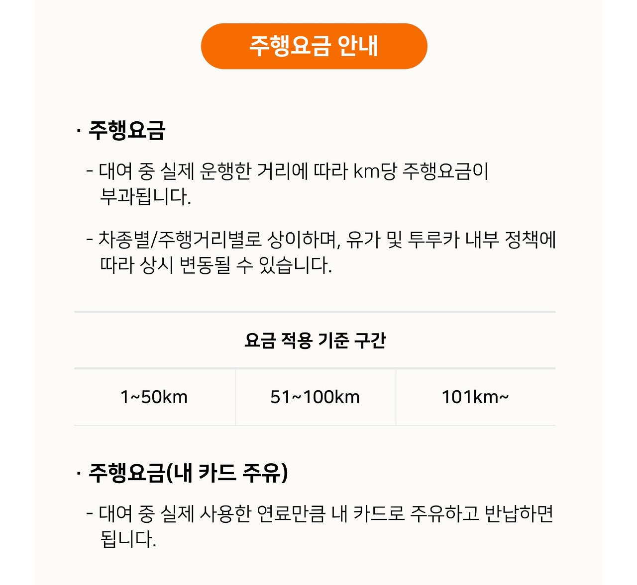 투루카는 유종과 차종에 따라 주행 요금을 다르게 설정해 두고 있습니다. 기본적으로 3가지 단계로 주행거리를 나누어 두었습니다. 참고로, 모닝같은 경형은 50km 이하는 170원, 100km 이하는 160원, 100km 이상은 140원입니다.