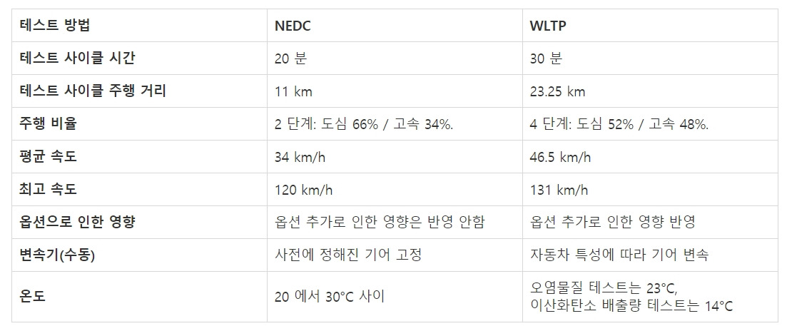 따라서 시험조건이 소비자인 운전자의 실제 주행에 최대한 가까워야 하는 것이 중요했다. NEDC와 WLTP 테스트의 주요 차이점은 다음과 같다.(유럽기준)